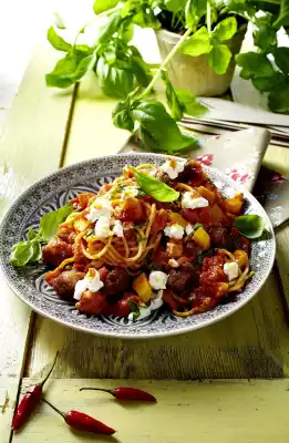 Heat the oil in a large pan, fry the sausage in it and take it out. Fry the pumpkin in the frying fat for about 5 minutes. Add onion and garlic and fry for 2-3 minutes. Add chilli, season with salt, pepper and sugar.