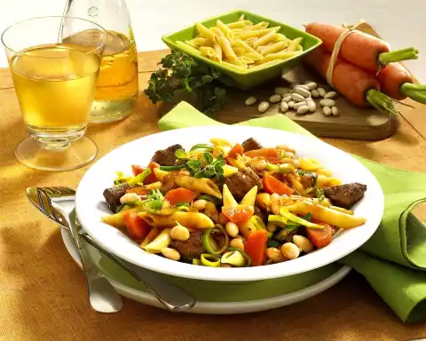 Heat oil in a pan. Brown the meat in it, season with salt, pepper and marjoram. Add onion and carrots to the meat. Dust with flour. Add tomato paste and stock, bring to the boil and cook for about 15 minutes. Cook pasta in boiling salted water according to package instructions. Add leek and beans to the meat about 5 minutes before the end of cooking time. Pour pasta onto a sieve and drain. Arrange noodles and ragout on plates.