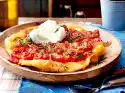 Wash, clean and slice the tomatoes. Peel and finely dice onions and garlic. Drain olives and cut into rings. Wash oregano and parsley, shake dry and chop finely.