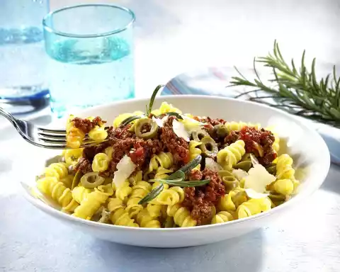 Cut olives into thin slices and add half of them to the sauce. Season to taste with salt and pepper. Drain the pasta and let it drain. Serve with the sauce and the rest olives. Slice parmesan cheese over it. Garnish with the rest of the rosemary if you like.