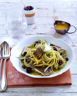 Drain the olives, capers and anchovies. Cut olives into rings. Cut anchovies into pieces. Cook the pasta in boiling salted water according to the instructions on the packet. Wash the fish, dab dry and cut into pieces.
