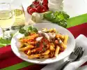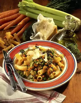 Clean and wash the zucchini, also dice finely. Celery clean, wash and cut into thin slices. Heat oil in a pan. Fry garlic and onions until golden brown. Add the vegetables and continue steaming for about 5 minutes. In the meantime wash and chop the herbs. Season vegetables with salt, cayenne pepper and herbs. Deglaze everything with stock and cream, bring to the boil again and season to taste. Serve pasta with the vegetables and sprinkled with parmesan.