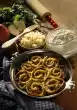 Cook the pasta in boiling salted water for 10-12 minutes. Peel and finely chop onion and garlic. Heat the fat in a pot and fry the onion and garlic. Add tomatoes with juice and let it boil down for about 10 minutes. Pluck the basil from the stalks except for a little bit for garnishing, chop finely and add to the sauce. Season to taste with salt and pepper. Arrange noodles on plates, add sauce and garnish with basil
