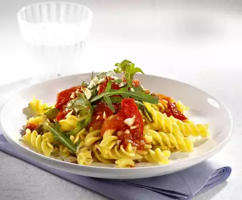 Add the tomatoes, fry while turning and season with salt, pepper and paprika. Deglaze with tomato juice, bring to the boil and simmer at medium heat for about 8 minutes. Meanwhile clean, wash and drain the rocket. Season sauce with salt, pepper, paprika and sugar. Fold in the rocket. Pour the pasta into a sieve and drain. Serve pasta with sauce and almonds sprinkled on 4 plates