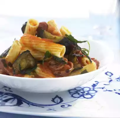 Take it out. Meanwhile cook the noodles in plenty of boiling salted water for 10-12 minutes. Fry aubergines in hot sausage fat while turning them golden brown. Add the onion and garlic and fry. Season with salt and pepper.