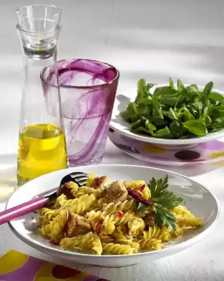 Stir in the onion. Clean, wash and drain the lamb's lettuce. Mix the lamb's lettuce with the marinade. Arrange noodles on plates. Garnish with parsley and chilli. Serve with lamb's lettuce.
