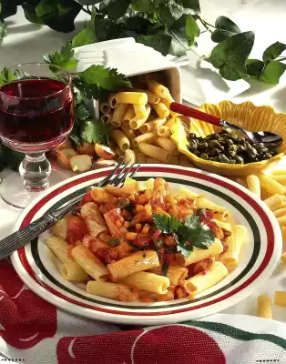 Drain the capers. Wash parsley and chop except for something to garnish. Stir both into the ragout. Season to taste with salt and cayenne pepper. Drain the pasta and arrange on plates with the ragout. Serve garnished with parsley