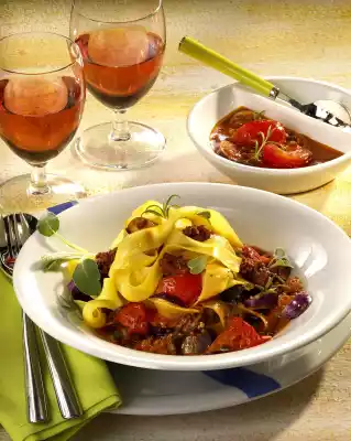 Cut tomatoes into pieces. Season the minced sauce with salt, pepper, ajwar and prepared herbs. Add tomatoes and 400 ml water. Let it boil down for another 5 minutes at high heat. Season the sauce if necessary. Arrange noodles and sauce garnished with fresh herbs on plates
