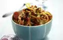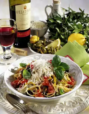 Meanwhile, cut the spaghetti into thirds. Pour into plenty of boiling salted water and cook for nine minutes. Drain the pasta, quench briefly, mix with the vegetable sauce and sprinkle with cheese. Serve in deep plates garnished with basil as desired.
