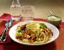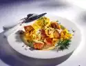 Peel the skin from the peppers, remove the seeds and cut into fine strips. Heat olive oil in a large frying pan, fry onions until translucent, add garlic and fry briefly. Add aubergines and pieces of tomato and braise for ten minutes while turning.