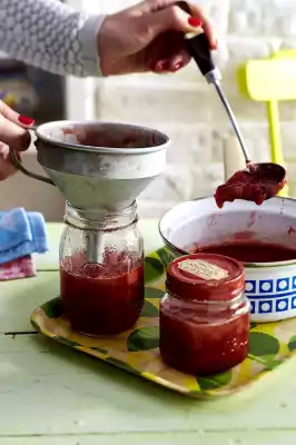 Immediately pour the jam into a measuring jug or use a funnel to fill the jars brimful by brim. Screw the jars tightly and turn them upside down for about 5 minutes. This allows the remaining air to escape.