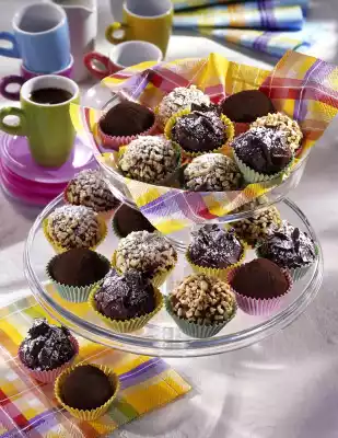 Form approx. 36 balls from the dough. Turn into chocolate shavings, cocoa or almonds and refrigerate for at least 1 hour. If necessary, dust with icing sugar and place in the praline cups
