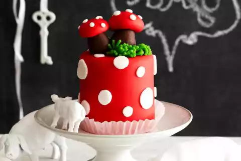 Place over the tartlets, press firmly at the top and press down with the palms of your hands over the edge so that the tartlets are coated. If necessary, smooth the fondant with a fondant smoother. Cut off any excess fondant and set aside for the mushroom caps.