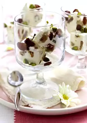 Remove the nougat ice cream from the mould and sprinkle with the remaining sultanas and chopped pistachios