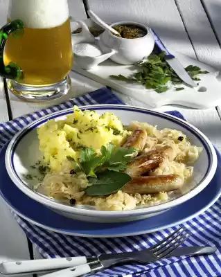 Covered sauerkraut and braise over medium heat for about 40 minutes. Peel, wash and halve the potatoes. Boil potatoes covered with salted water and cook for about 25 minutes. Heat up milk. Drain potatoes and mash roughly.