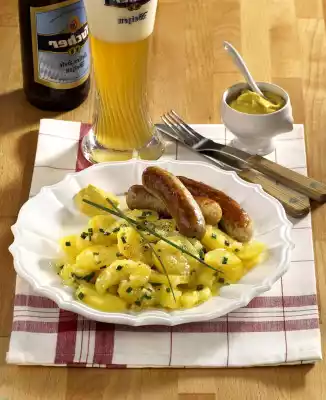 Add 3 tablespoons of oil. Season to taste with salt, pepper and sugar. Drain potatoes, rinse and peel. Cut the potatoes into slices, pour the marinade over them and let it stand for a while. Heat 2 tablespoons of oil in a pan and fry the sausages in it for about 10 minutes. Wash the chives and, except for something to garnish, cut into small rolls and add to the potato salad. Season to taste again. Serve the potato salad together with the Nuremberg sausages. Garnish with chives.
