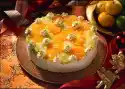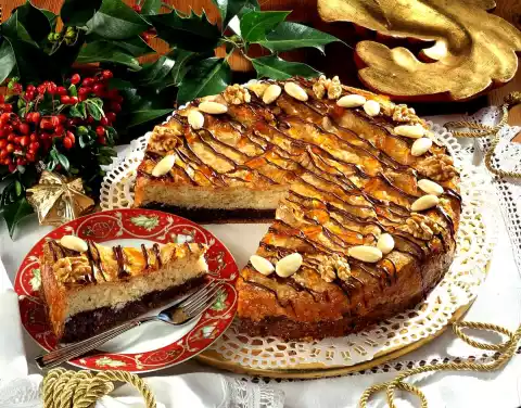 Remove the hot cake from the edge with a sharp knife and let it cool down in the tin. Warm up the orange marmalade. Remove the cake from the tin, spread jam all around and let it dry. Coarsely chop the chocolate coating and melt it on a hot water bath. Let it cool down a bit, put it into a freezer bag and cut off a small corner. Decorate the cake with chocolate strips, walnuts and almonds. Makes about 16 pieces
