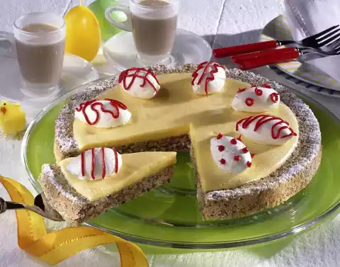 Leave to cool in the mould. Soak gelatine in cold water. Stir egg yolk and starch until smooth. Bring 100 g cream and sugar to the boil, remove from the heat. Stir in the egg yolks. Keep stirring until a creamy mixture is formed. Whip butter in pieces in the warm cream and spread on the cake. Chill for about 20 minutes. Whip 200 g cream until stiff. Dissolve gelatine and stir into the cream. Put the cream in a cool place and let it gel. Dip a teaspoon into hot water, cut off 8 small eggs and place on the cake.