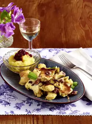 Fry for another 2-3 minutes. Remove. Arrange apple compote in 4 bowls and add 1 teaspoon cranberries to each. Serve with Kaiserschmarrn. Decorate with mint.