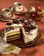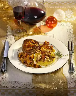 Add milk and cream. Bake in the preheated oven (electric cooker: 200 °C/ convection oven: 175 °C/ gas: level 3) for about 45 minutes. In the meantime peel and halve the onions and cut them into fine strips. Drain the chanterelles. Heat the oil in a pan. Tie the fillet steaks with kitchen string and fry them in the hot oil for approx. 6 minutes, turning them over. Season with salt and pepper, remove from the pan, wrap in aluminium foil and keep warm. Put the fat in the hot pan and fry the onions for about 2 minutes while turning. Add chanterelles and fry everything for about 3 minutes. Deglaze with beef stock and cook again for about 1 minute.