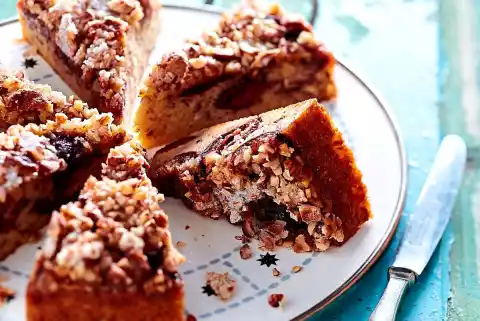 Wash, halve and stone the plums. Spread on the cake. Sprinkle with the remaining chopped nuts and 4 tablespoons of sugar. Bake in a hot oven for about 40 minutes. Remove the cake and let it cool down for about 10 minutes. Carefully remove from the tin and let it cool down on a cake rack.