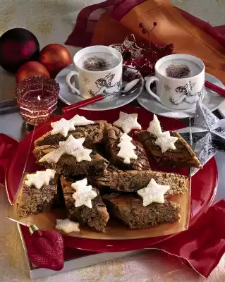Finally fold in chocolate and put everything into a well greased fat pan of the oven (38x34 cm). Place a greased aluminium foil rail on the open, diagonally flattened long side and smooth down the dough. Bake in the preheated oven (electric oven: 175 °C/ gas: level 2) for approx. 25 minutes. Let the cake cool down on the baking tray. In the meantime knead the raw marzipan mixture and 30 g icing sugar. Sieve the remaining icing sugar onto the work surface and roll out the raw marzipan mixture onto it. Cut out small stars, sniffles and fir trees. Spread a thin layer of egg white on the stars and trees and sprinkle with the remaining sugar. Coarsely chop the couverture and melt it on a hot water bath. Cut the cake into rhombuses and lift it from the tray.