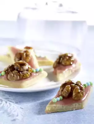 Pull the walnuts through the caramel and put them on the cookies. Decorate the cookies with sugar pearls and let them dry. Keep cookies cool and dry.
