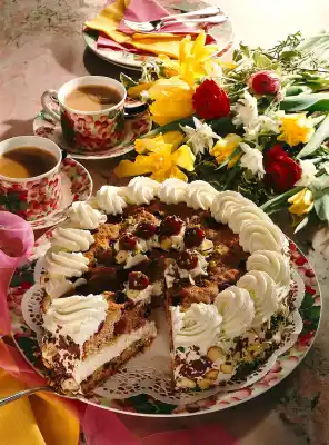 Press hazelnut flakes, pistachios and chocolate flakes to the edge. Pour the rest of the cream into a piping bag with a star-shaped spout and decorate the edge of the cake with ribbons and in the middle with cream tuffs.