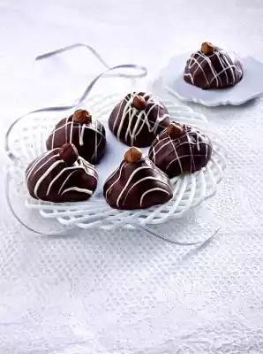 Chop the chocolate separately and melt over a warm water bath. Coat mountains with dark chocolate and decorate them with white chocolate stripes using a spoon. Place a whole hazelnut on each top.