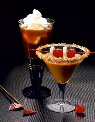 Strain into the glass and place a skewer of cocktail cherries and banana slices on the glass.