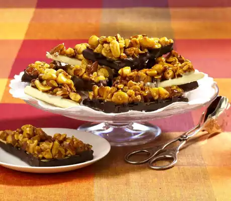 Deglaze with rum and cream. Simmer while stirring until you get a smooth caramel. Stir in nuts and spread over the triangles. Leave to dry for about 30 minutes. Coarsely chop the chocolate coating. Melt the dark and white couverture separately on a warm water bath. Dip 9 corners halfway into the dark couverture with the help of 2 forks, drip off and let dry on a grid. Cover the remaining corners with the white couverture as well