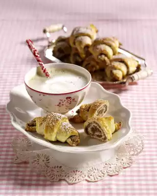 Coat the triangles with the hazelnut filling, roll up from the narrow side to the top and bend into croissants. Place on 2 baking trays lined with baking paper. Whisk 1 egg yolk and cream. Brush the croissants with it. Bake the trays one after the other in a preheated oven (electric range: 175 °C/ convection oven: 150 °C/ gas: level 2) for about 20 minutes. Remove from the oven, allow to cool and dust with icing sugar