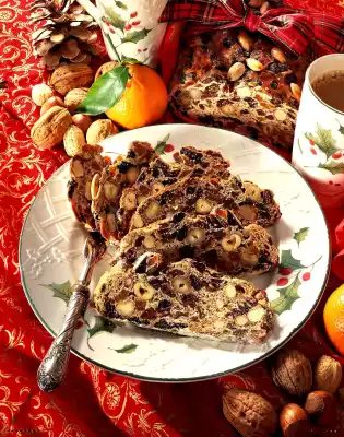 Dice the apricots and figs. Mix with raisins, hazelnuts, 3 tablespoons of honey, rum, cinnamon and clove powder and leave to stand. Mix flour, yeast and salt. Add fat, remaining honey and lukewarm milk.