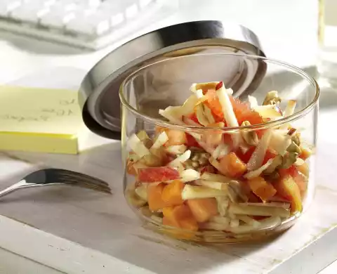 Peel the grapefruit so that the white skin is completely removed. Remove the fillets with a sharp knife between the parting skins. Wash the apple, quarter it, remove the seeds, cut into strips and add to the grapefruit fillets.