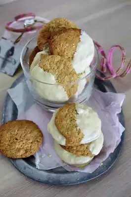 Chop the couverture and melt in a hot water bath. Dip the cookies halfway into the chocolate coating, drain briefly and then allow to dry.