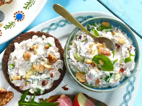 Mix walnuts, except for a little bit for sprinkling, spring onions, basil, tomatoes, 3 tablespoons of tomato oil and low-fat curd, season with salt, pepper and sugar. Spread the slices with it