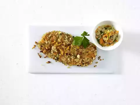 Dab meat dry. Season with salt and pepper. Turn the meat one after the other first in flour, then in egg and finally in carrot-hazelnut breading. Heat oil in a large pan. Fry escalopes in portions for 6-8 minutes until crispy brown, turning once.