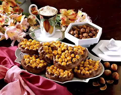 Cover and put in a cool place for about 30 minutes. In the meantime, roast the nuts in a hot, dry pan for approx. 10 minutes while turning. Place the still hot nuts on a tea towel and rub in the towel until the skin comes off.