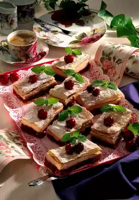 Defrost puff pastry slices at room temperature. Place slices on top of each other and roll out into a rectangle (approx. 30 x 40 cm) on a floured work surface. Place the slices on a baking tray lined with baking paper, prick several times with a fork and leave to rest for about 15 minutes. Whisk the egg yolk with 1 tablespoon of water and spread it on the puff pastry sheet. Bake in the preheated oven (electric cooker: 200 °C/ gas: level 3) for 15-18 minutes. The plate contracts slightly during baking. After baking, cut in half lengthwise. Cut 1 half into 9 pieces of about 5 x 10 cm. Place a multiple folded aluminium foil edge around the 2nd half. Drain the sour cherries and collect the juice. Boil up the juice. Stir the starch with a little water until smooth, stir into the boiling juice and bring to the boil again. Fold in the cherries. Put the compote on the puff pastry and let it cool down. Soak the gelatine in cold water, squeeze it out, dissolve at low heat, mix with the yoghurt and liqueur. Allow the mixture to set a little. As soon as the yoghurt begins to set, pour it onto the cherry compote and smooth it down. Put the slices in the fridge for about 4 hours. Then remove the aluminium foil edge. Place the cut puff pastry pieces on the yoghurt and cut into pieces. Dust the slices with the icing sugar. Warm up the jelly. Wash the cherries, dab dry, dip into the jelly and allow to drain. Serve the slices decorated with the glazed cherries and mint leaves. Results in about 9 slices