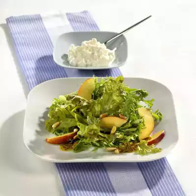 Wash salads, dab dry and cut into pieces. Roast pine nuts in a pan without fat, remove and let cool. Wash, halve and stone the nectarines. Cut the flesh into slices.