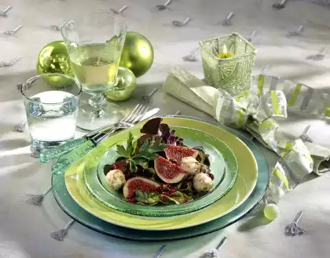 Clean and wash the salad and pluck into bite-sized pieces. Wash figs, cut into slices. Chop walnuts. Form cream cheese into small balls and turn in the chopped nuts. Arrange prepared ingredients in portions.