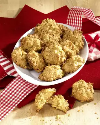 Stir everything into the fat-oatmeal mixture. Using 2 teaspoons, place small heaps on three baking trays lined with baking paper. Bake the trays one after the other in a preheated oven (electric cooker: 175 °C/ convection oven: 150 °C/ gas: level 2) for about 20 minutes.