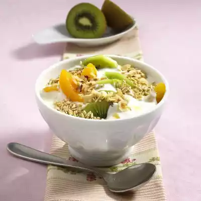 Roast the hazelnut flakes in a pan without fat, remove. Peel and slice the kiwi. Cut apricot halves into 3 slices each. Mix yoghurt and apple syrup.