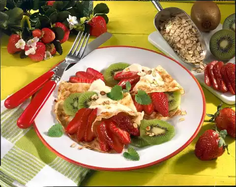 Mix egg, milk and flour to a smooth pancake batter. Let the dough swell for 15-20 minutes. Wash, drain and clean the strawberries. Cut strawberries into slices. Peel and slice the kiwi.