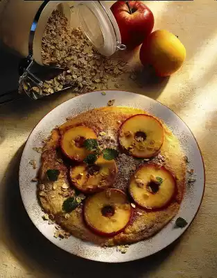 Mix flour, milk, eggs and salt with the whisk of the hand mixer until smooth. Stir in the oat flakes. Wash apples thoroughly, rub dry and cut out the core. Then cut the apples into slices. Melt some fat in a pan.