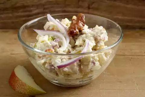 Chop the walnut kernels and roast them in a pan without fat. Peel and finely dice the onion. Wash, quarter, core and finely dice the pear. Drizzle with fruit brandy.