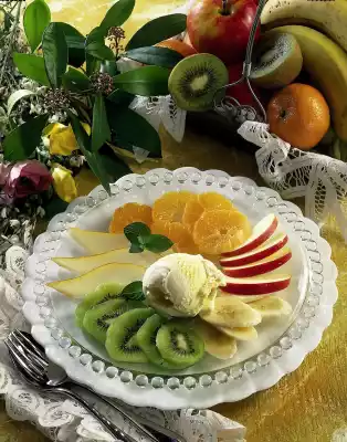 Peel kiwis, mandarins and bananas and cut them into slices. Wash, clean and quarter apples and pears. Cut out the core and slice the fruit into thin slices. Mix lemon juice, liquid sweetener and fruit sugar.