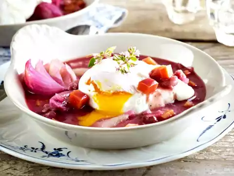 Remove the herb bouquet from the sauce. Season the sauce with salt, pepper and 1 pinch of sugar. Serve with sauce and eggs.