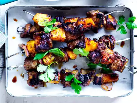 Put meat, pineapple and onions alternately on skewers. Spread the skewers on the baking tray and bake in a hot oven for about 8 minutes. After about 4 minutes turn the skewers. Serve with salad.
