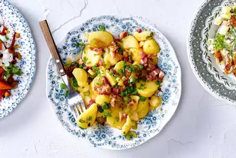 Peel and slice the potatoes. Mix with the hot bacon broth. Marinate for at least 1 hour.